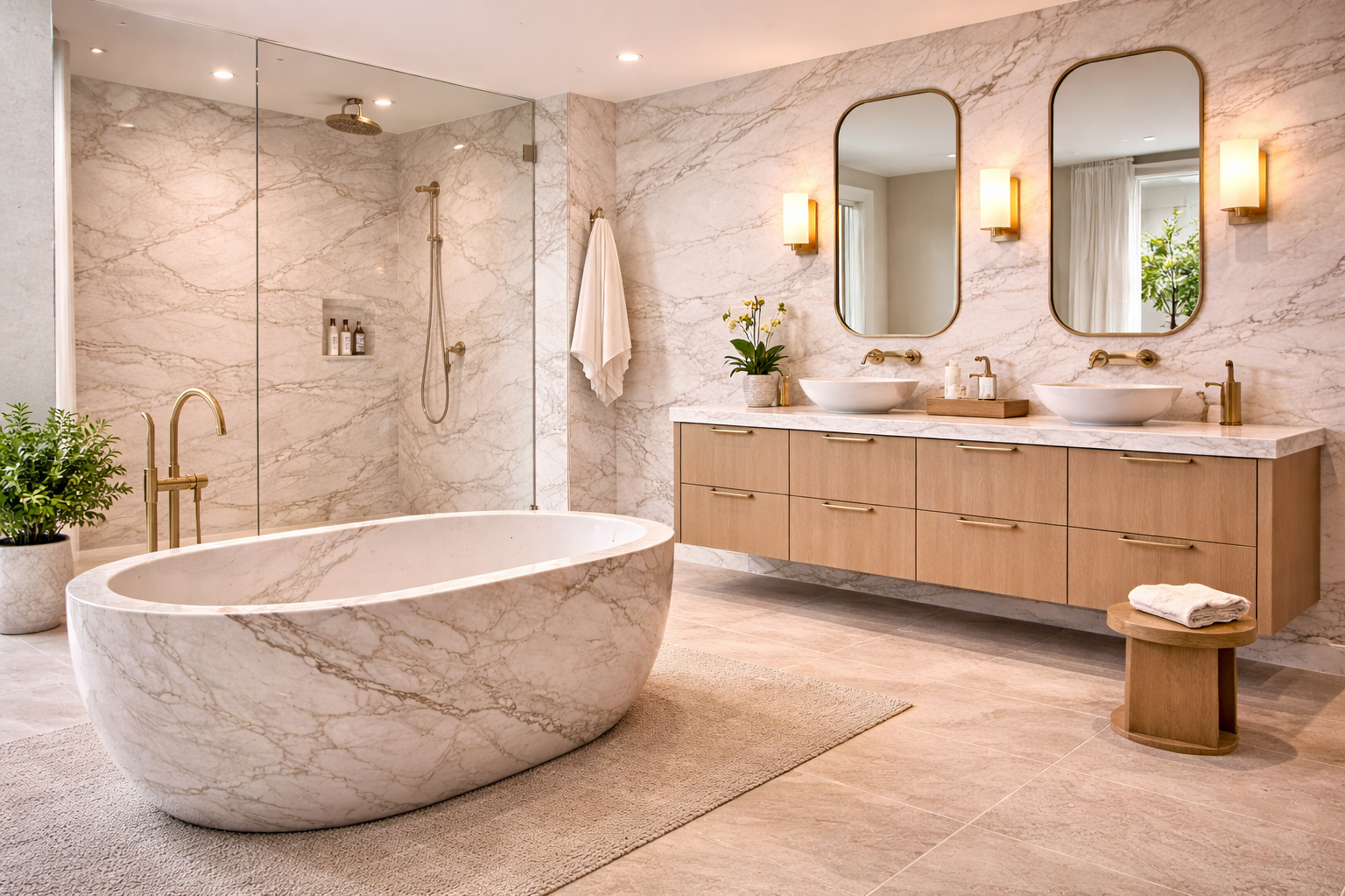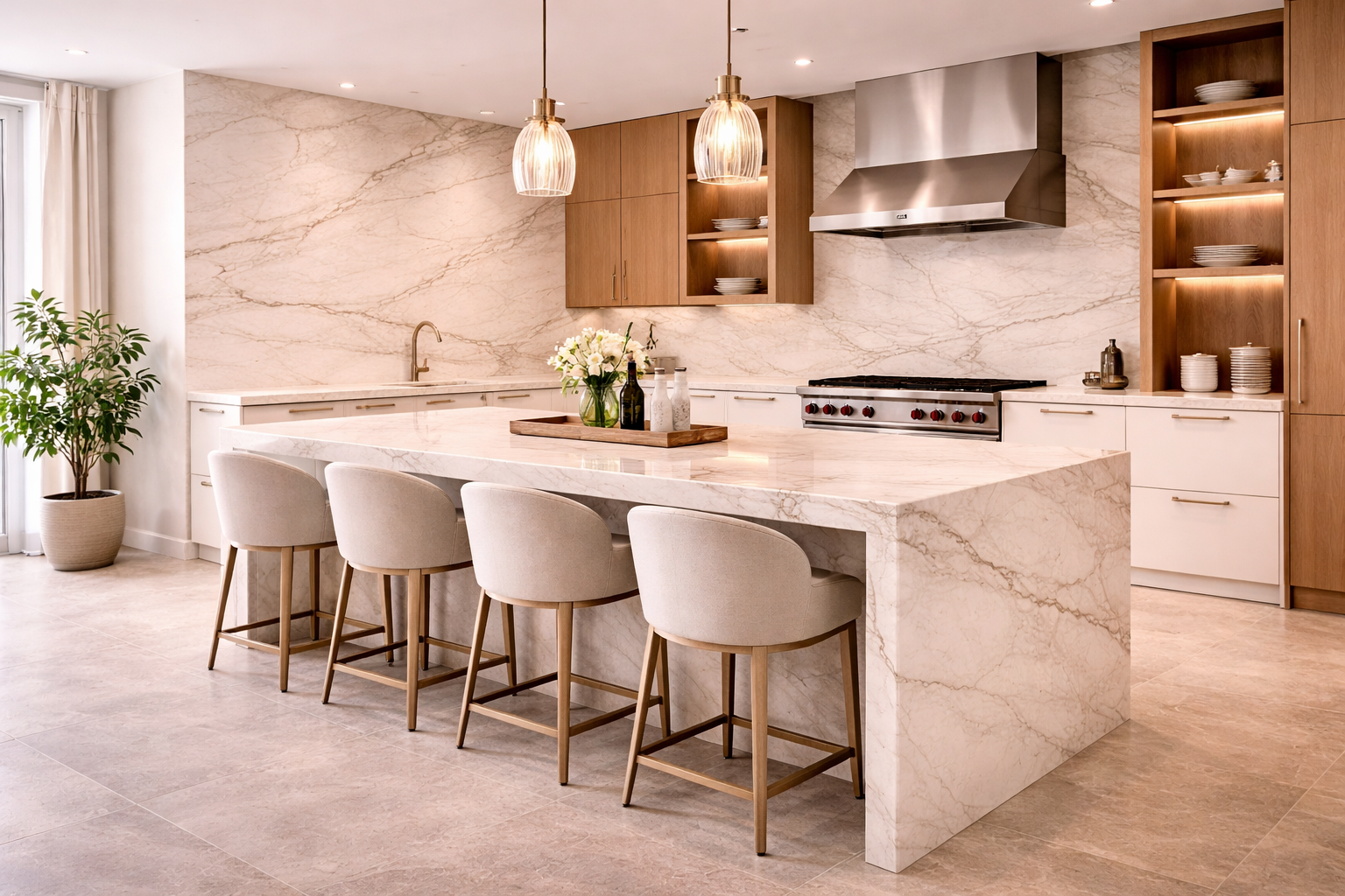 Texta blanc aux veinages élégants et naturels. Une pierre lumineuse et raffinée, idéale pour des réalisations modernes et haut de gamme.