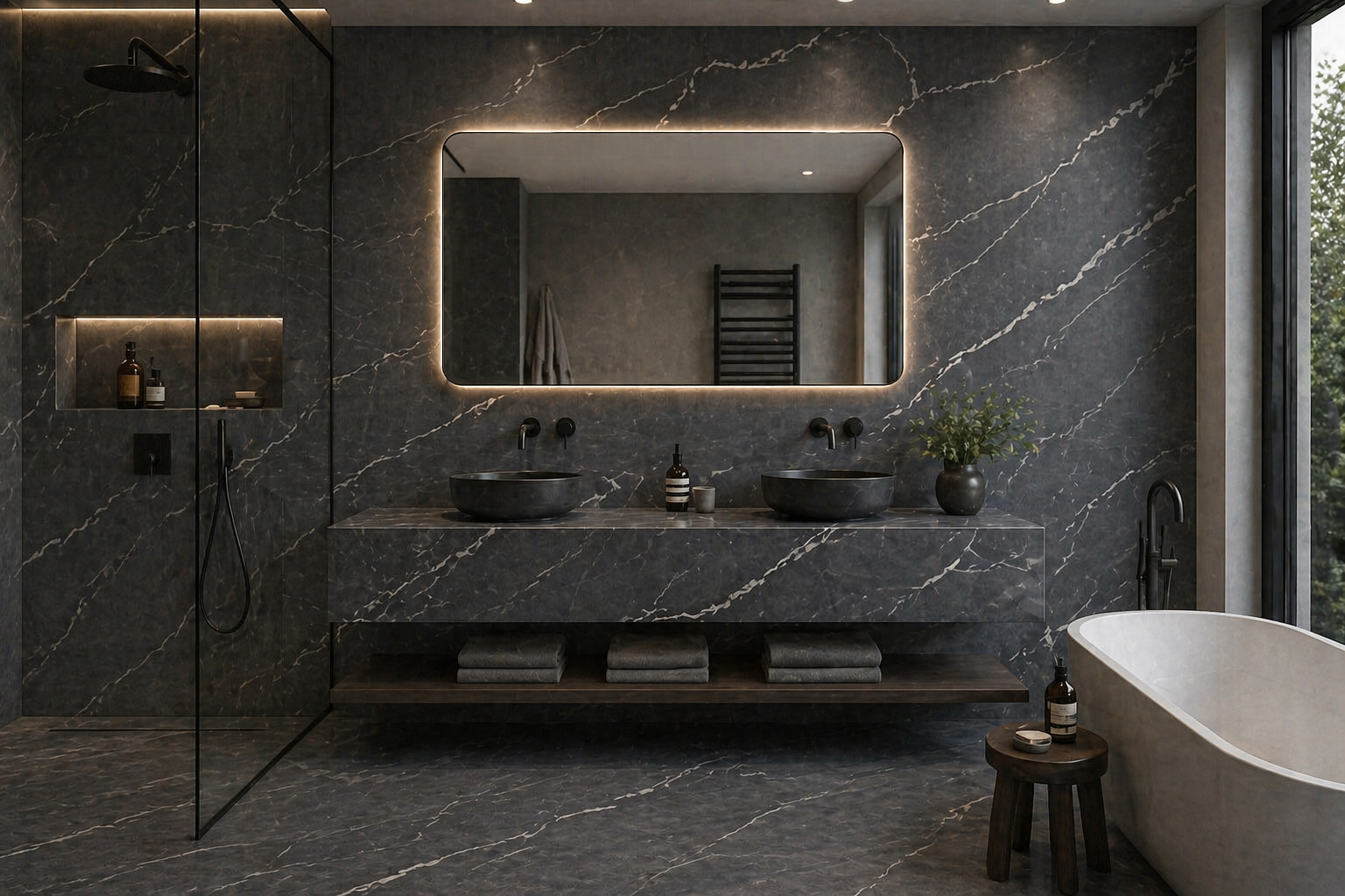 Le Negresco en quartz se distingue par sa profondeur noire intense et son veinage subtil aux nuances élégantes. Une matière puissante et contemporaine, idéale pour des projets architecturaux haut de gamme et contrastés.