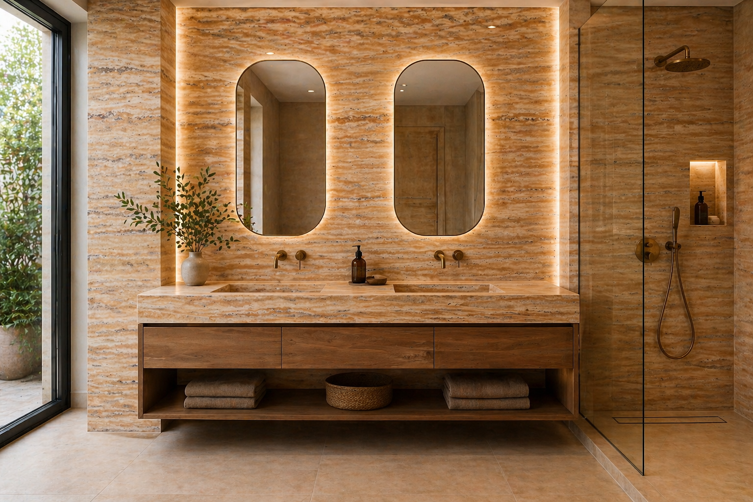 Le Travertino Dourado séduit par ses nuances beige doré et sa texture naturelle caractéristique. Élégant et chaleureux, il apporte authenticité et raffinement aux projets intérieurs et extérieurs.